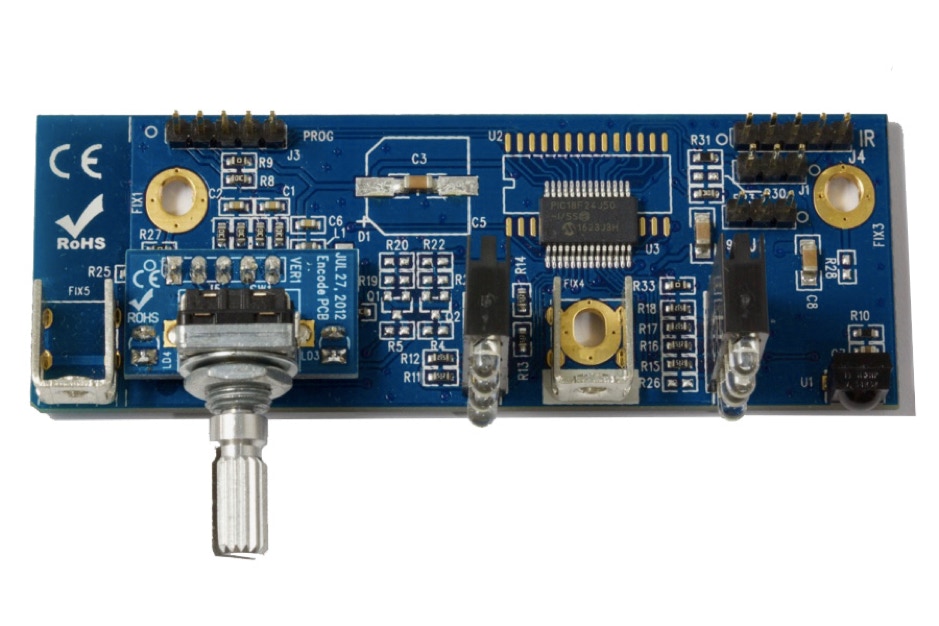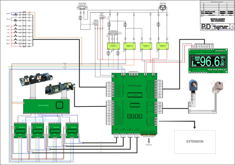 Les signaux de la carte Minidsp VOL-VP sont acheminés vers le microcontrôleur afin des les signaliser sur l’écran de l'afficheur. La cellule IR est déporté sur la face avant afin de sélectionner les sources ou les configurations. L'autre cellule IR reste en lieu et place afin d'ajuster le volume et d'autre fonction. Normalement la télécommande initiale pour les PGA devrait pouvoir s'adresser aux deux recepteur.