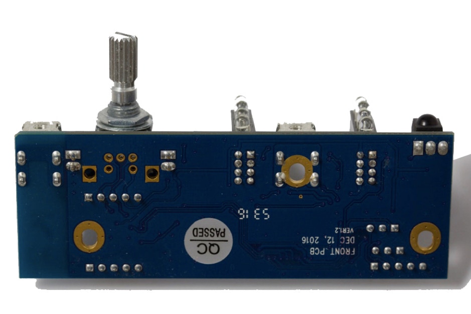 La face avant est récupérée intégralement avec tous ses organes depuis la version V2. On récupère ainsi le codeur optique, les boutons poussoirs, l'afficheur VFD, le bouton ON/OFF ainsi que le récepteur IR pour la télécommande.