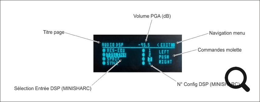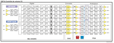 Le PIC est en liaison avec le DSP. Cela permet de piloter certaines fonctions directement depuis la face avant du contrôle de volume ainsi que de visualiser sur l'afficheur les sélections actives.