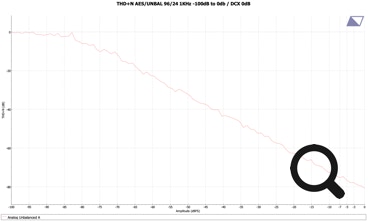 Concernant la distorsion on note qu’en dessous de -80dB elle est très élevé mais linéaire jusqu’à 0dB avec -80dB de distorsion soit environ 0.01% ce qui est relativement faible mais pas non plus extraordinaire.