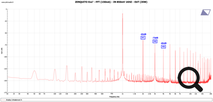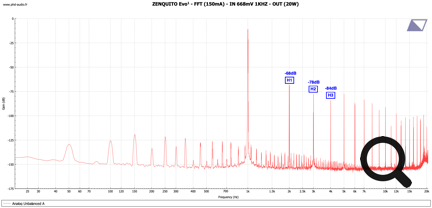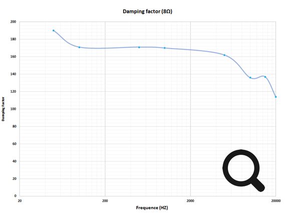 Le facteur d’amortissement est globalement bon 170 à 1W. Il chute légèrement au dessus de 5KHz et remonte en dessous de 100Hz. Encore une fois pour un ampli de cette nature : c’est bon !