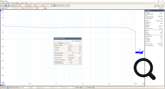 Un balayage en fréquence de 0 à 100KHz permet d’apprécier la bande passante qui est plate jusqu’à 25KHz. Au-delà elle perd légèrement en amplitude mais reste acceptable jusqu’à 40KHz.