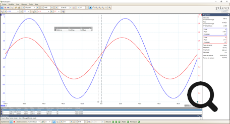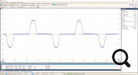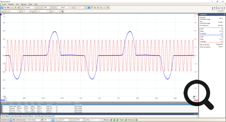 On utilise un générateur de signaux très faible distorsion afin d’injecter un signal sinusoïdal. Visuellement il est difficile de voir une quelconque déformation On notera seulement un retard de l’ordre de 3.5us qui ne varie pas en fonction de la fréquence mais qui est plus visible à haute fréquence, dans notre exemple à 10KHz.