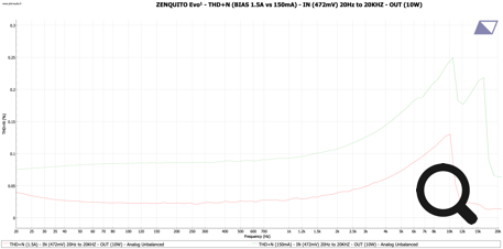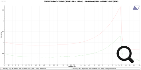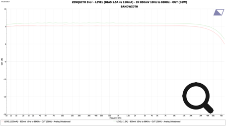 La bande passante comme déjà validé avec l'oscilloscope est stable sur toute la largeur de bande audio depuis 10Hz jusqu'à 25KHz. Fréquence de coupe à -3dB de 50KHz ce qui est parfait. Quelque soit la polarisation le résultat est le même à l’exception d'un gain légèrement supérieur sur la version AB(150mA) liée à une tension d'alimentation supérieur dans ce cas de figure.