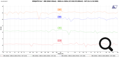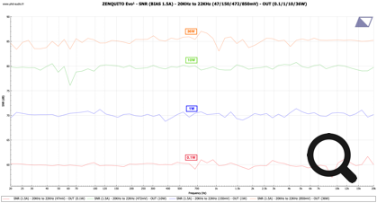 Le rapport signal sur bruit est stable en fréquence. Il augmente en fonction de la puissance de sortie pour atteindre son maximum à 85dB ce qui n'est pas exceptionnel mais correct tout de même. En classe AB on note une très légère amélioration du SNR qui est liée à la tension de sortie plus élevé du fait de la polarisation plus faible.
