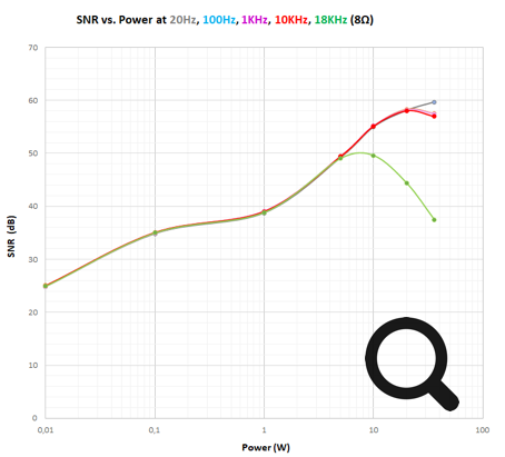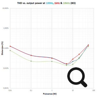La THD+N en fonction de la puissance est relativement stable jusqu'à une dizaine de Watts. Au delà elle augment plus rapidement jusqu'à s’envoler à l'approche de la puissance maximale. Rien d'anormale en soit, c'est une distorsion plutôt bien contenu en fonction de la puissance. On voit clairement la différence entre les deux polarisations.