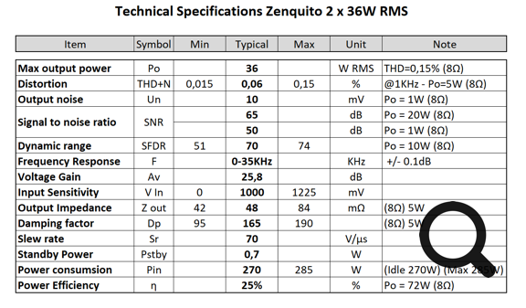 En conclusion le ZENQUITO est un ampli aux caractéristiques correctes à utiliser sur des enceintes de rendement moyen ou élevé. A conseiller sur tout type de haut-parleur ou compressions.