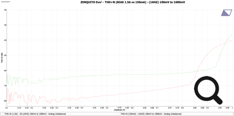 Puis une deuxième série à 1.5A pour la classe A. Il est alors évident de voir l'amélioration que procure la classe A vise a vis de la classe AB surtout sur les petits signaux, c'est a dire lors de faibles niveaux d'entrée.