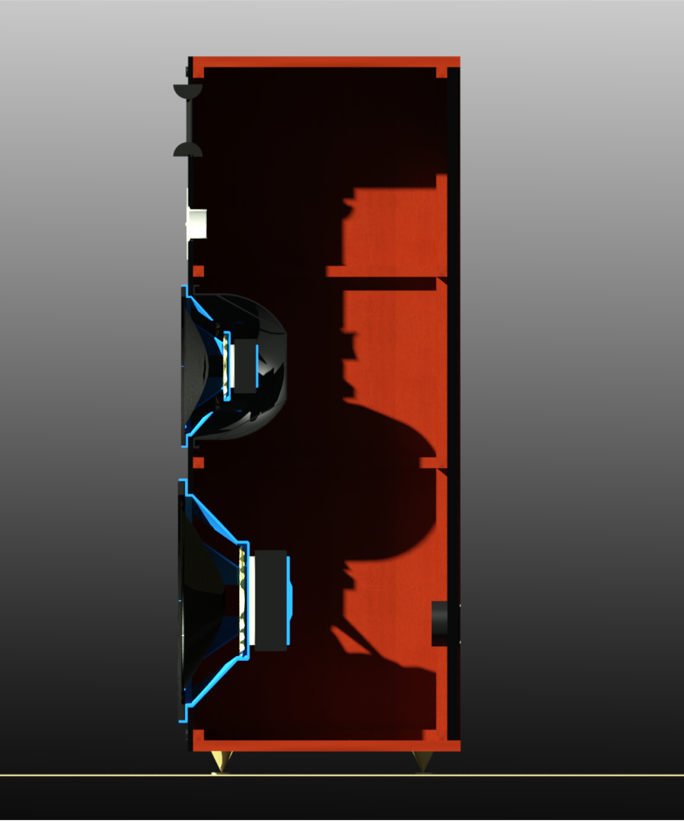 La charge retenue pour les graves est de type Bass reflex d’un volume de 250L avec un accord à 40Hz.