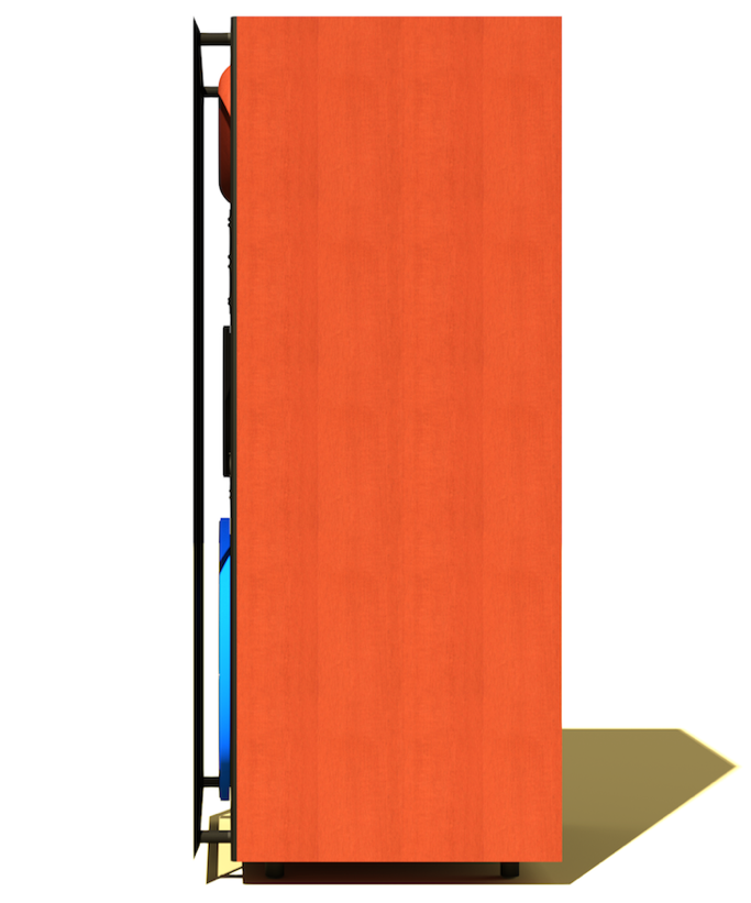 La caisse est la même de l'enceinte principale V1. La façade est modifiée. Provisoirement pour les essais une planche de contre plaqué vient boucher l'emplacement de l'ancien médium MONACOR SP-30 PATC en diamètre 300mm afin de pouvoir monter le nouveau PHL 3431 en diamètre 250mm.