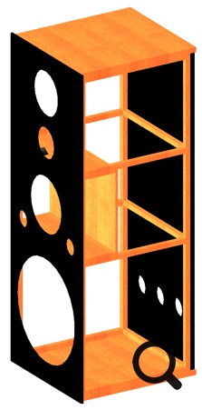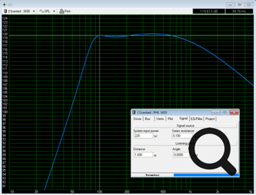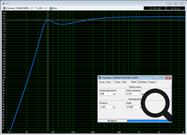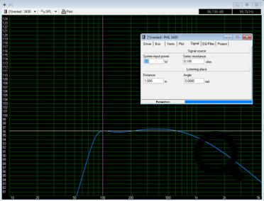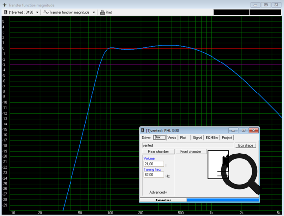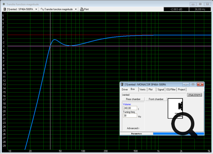 Bien que le hautparleur de basse soit le même que celui de l’enceinte principale V1, l’accord doit être revu car la volume disponible est réduit du fait de l’augmentation de la charge du médium. On ne dispose plus que de 240L avec un accord à 38Hz. Cet accord est choisi un peu bas volontairement car j'ai prévu de relever la courbe d'équalisation dans la zone 30-50Hz: Vive les filtre actif et la multi-amplification!