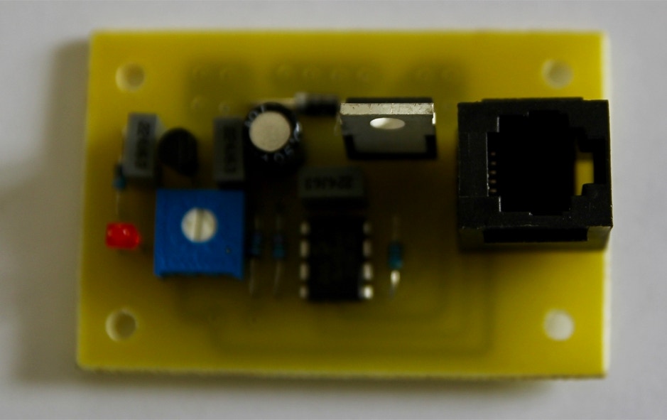 Un circuit imprimé simple face avec tous les composants. On soude les fils de raccordement directement sur la platine. Un connecteur RJ11 permet la programmation du PIC depuis le programmateur. Cela est également très utile pour le débogage ou la visualisation des valeurs durant l’exécution.