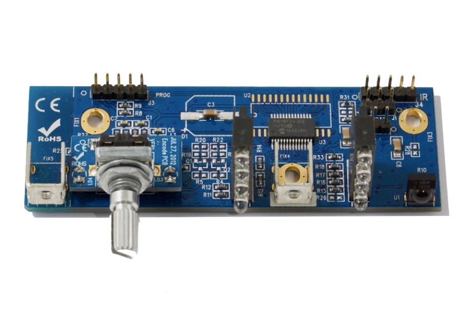 Les signaux de la carte Minidsp VOL-VP sont acheminés vers le microcontrôleur afin des les signaliser sur l’écran de l'afficheur. La cellule IR est déporté sur la face avant afin de sélectionner les sources ou les configurations. L'autre cellule IR reste en lieu et place afin d'ajuster le volume et d'autre fonction. Normalement la télécommande initiale pour les PGA devrait pouvoir s'adresser aux deux recepteur.