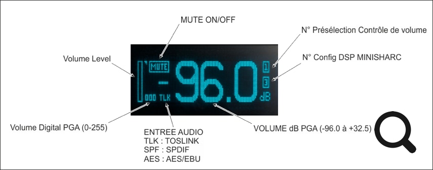 En clair on visualise l'entrée (TOSLINK, SPDIF ou AES/EBU) ainsi que la configuration sélectionnée (1 à 4). De même à partir du menu on peut sélectionner l'entrée tout comme le numéro de configuration.