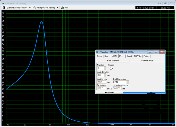 En ce qui concerne l'évent nous obtenons une vitesse de passage de 54m/s à 37Hz. Ca c'est empiré par rapport à la version précédente. Si besoin on remplacera l'évent par un plus gros.