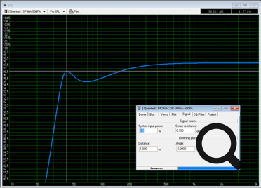 Bien que le hautparleur de basse soit le même que celui de l’enceinte principale V1, l’accord doit être revu car la volume disponible est réduit du fait de l’augmentation de la charge du médium. On ne dispose plus que de 240L avec un accord à 38Hz. Cet accord est choisi un peu bas volontairement car j'ai prévu de relever la courbe d'équalisation dans la zone 30-50Hz: Vive les filtre actif et la multi-amplification!