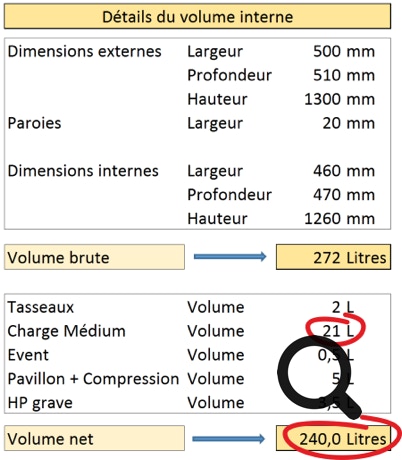 L’objectif est atteint, 21L de charge pour les médiums et 240L pour le HP des basses.