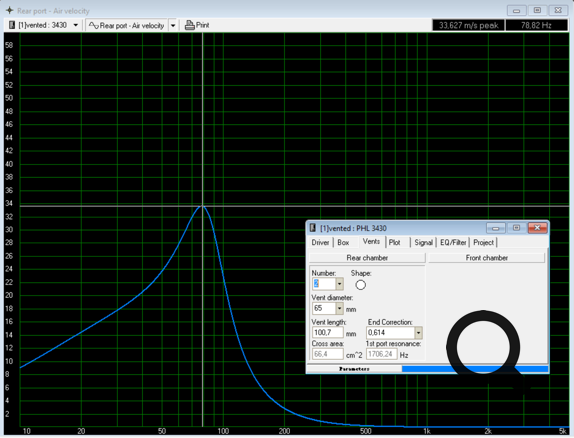 Concernant l'évent, la dimension minimum était grande et difficile à loger sur la façade. J'ai donc décidé d'en monter 2. Diamètre 65mm et longueur 100mm. Nous avons 34m/s à 74Hz. Ça pourrait être mieux mais ce n'est pas un problème.