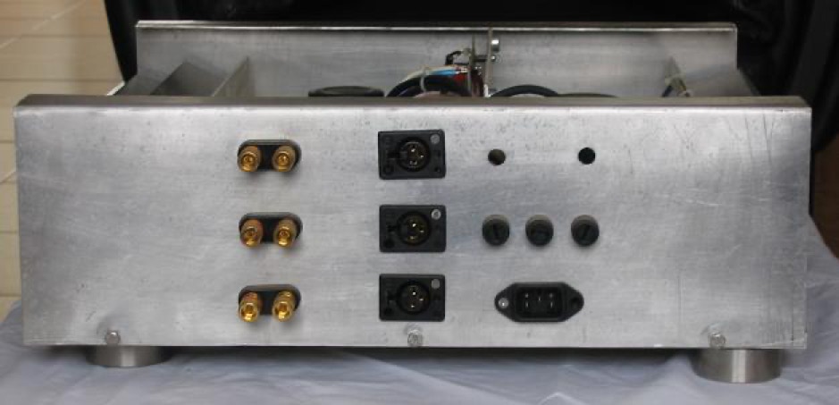 Les entrées bas niveau sont fixées au centre et câblée sur des fiches type XLR. Les raccordement vers le DCX seront ainsi réalisé par des cordon XLR/XLR. Les sorties HP sont fixées à gauche et câblées sur fiche dorée. Après coup je réalise que cela est une erreur car ces prise ne dispose d'aucune isolation et tout contact est dangereux pour l'ampli.