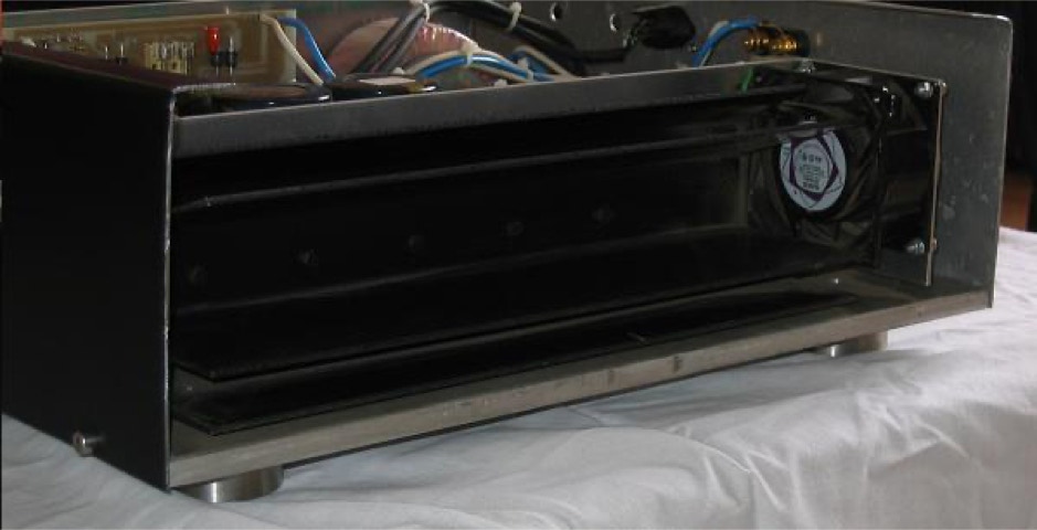 Pour plus de design la face avant est peinte en noir satinée et un capot en aluminium de 2.5mm perforé vient se clipser sur le dessus afin de fermer l'ensemble.