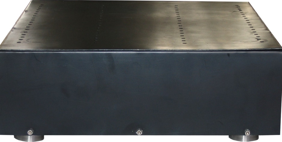 Ne souhaitant faire l'acquisition d'un coffret je me lance dans sa réalisation. La base est constituée d'une plaque en aluminium de 10mm d'épaisseur. C'est plus que suffisant pour supporter le poids total des 3 amplis de prêt de 15Kg et contribue au refroidissement. La dimension est de 450x450mm. Elle est percée et chanfreinée afin que toutes les vis montées par le dessous ne soit pas visible de l'extérieur.