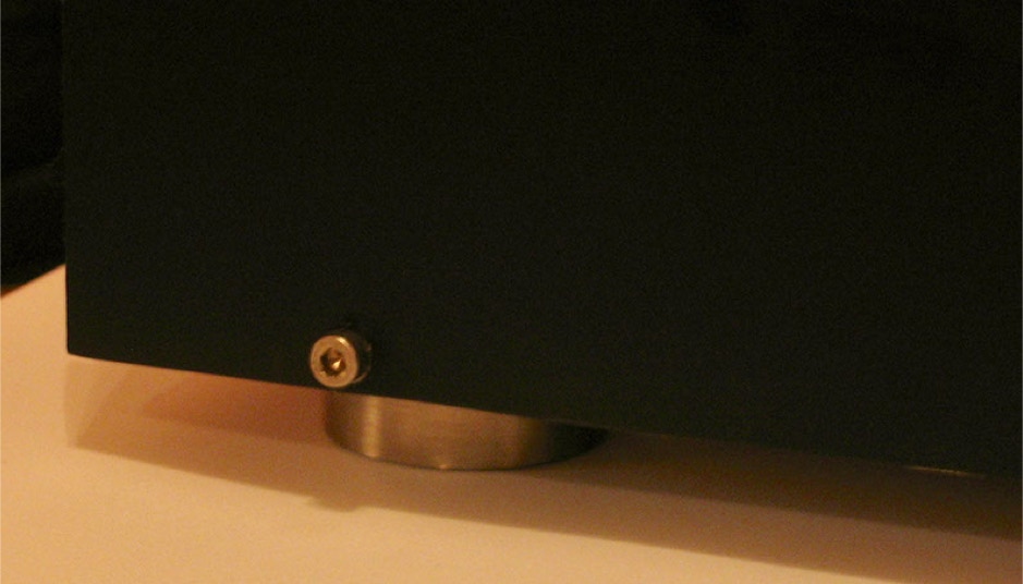 Pour les pieds des pastilles en inox ont été usinées dans la masse . C'est simple et efficace.