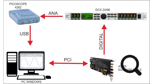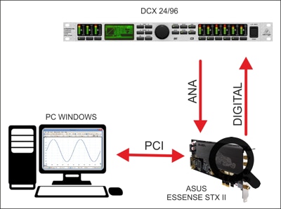 Avant de mesurer la qualité audio du DCX voyons tout d’abord si ce dernier rempli bien sa fonction. Les analyses sont effectués avec ARTA en utilisant une carte audio ASUS ESSENCE STX II. On envoie le signal en numérique et on reçoit la sortie du DCX en analogique sur l’entrée ligne.