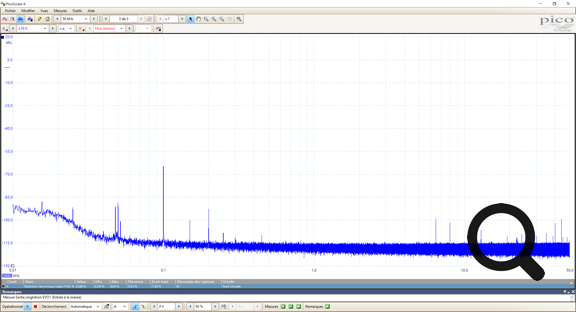 Sur la vue spectrale on gagne 30dB sur le planché de bruit, 15dB sur le 50Hz/100Hz et cerise sur gâteau, le spectre à présent est bien propre jusqu’aux hautes fréquences.