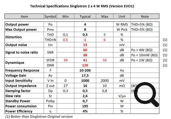 D’après le tableau ci-dessous les caractéristiques qui sont en amélioration par rapport à la version originale sont identifiées en rouge. Pour mieux comparer veuillez rejoindre la page des mesures SINGLOTRON (original)
