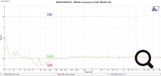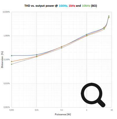 La THD+N est d’environ 0.5% en dessous de 100mW. Ensuite elle augmente progressivement en fonction de la puissance jusqu’à atteindre les 5% puis s’envole rapidement au-delà des 10%.