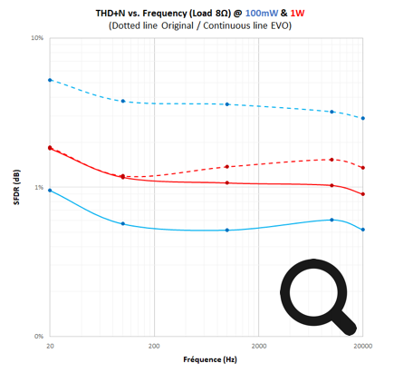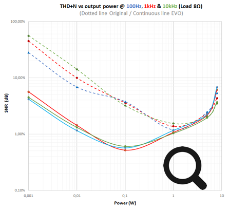 Sur la THD+N la différence est maintenant flagrante. Du fait de la forte diminution du bruit la THD+N est en forte amélioration du moins en dessous de 1W. Au-dessus pas d’amélioration du fait que la THD pure reprend le dessus et identique sur les deux versions.