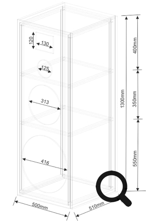 La première étape est de fixer le volume interne minimum requis en fonction des différentes charges. Soient 250L pour les basses et 15L pour les médiums. A cela faut rajouter les volumes de tous les autres éléments et prendre en compte l’épaisseur des parois.