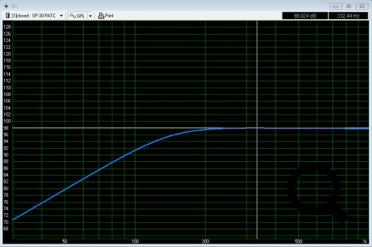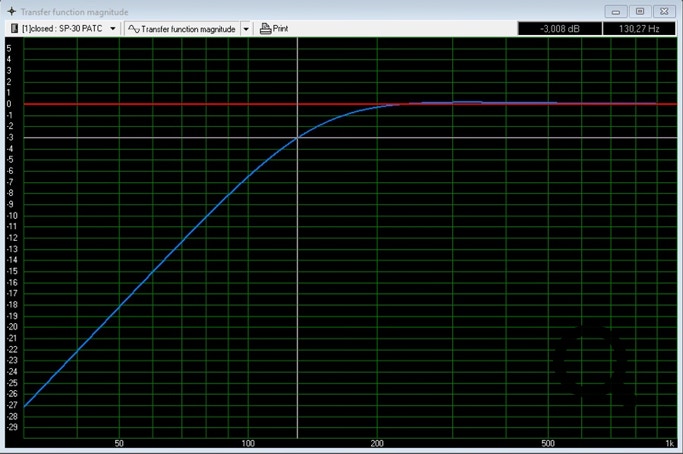 La charge est de type close avec un volume de 15L. La fréquence de coupure est de 130Hz à -3dB et d’environs 200Hz à 0bD. Le QTC est de 0.790.