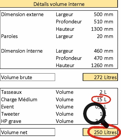 L’objectif est atteint, 15L de charge pour les médiums et 250L pour le HP des basses.