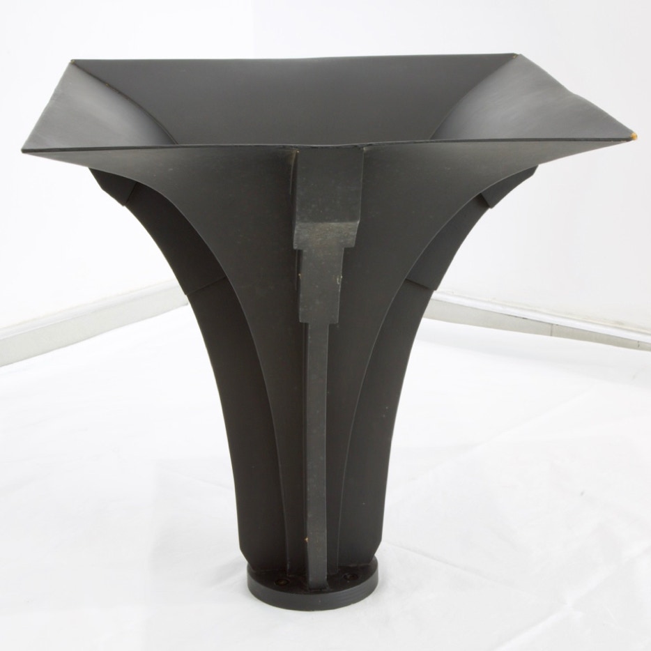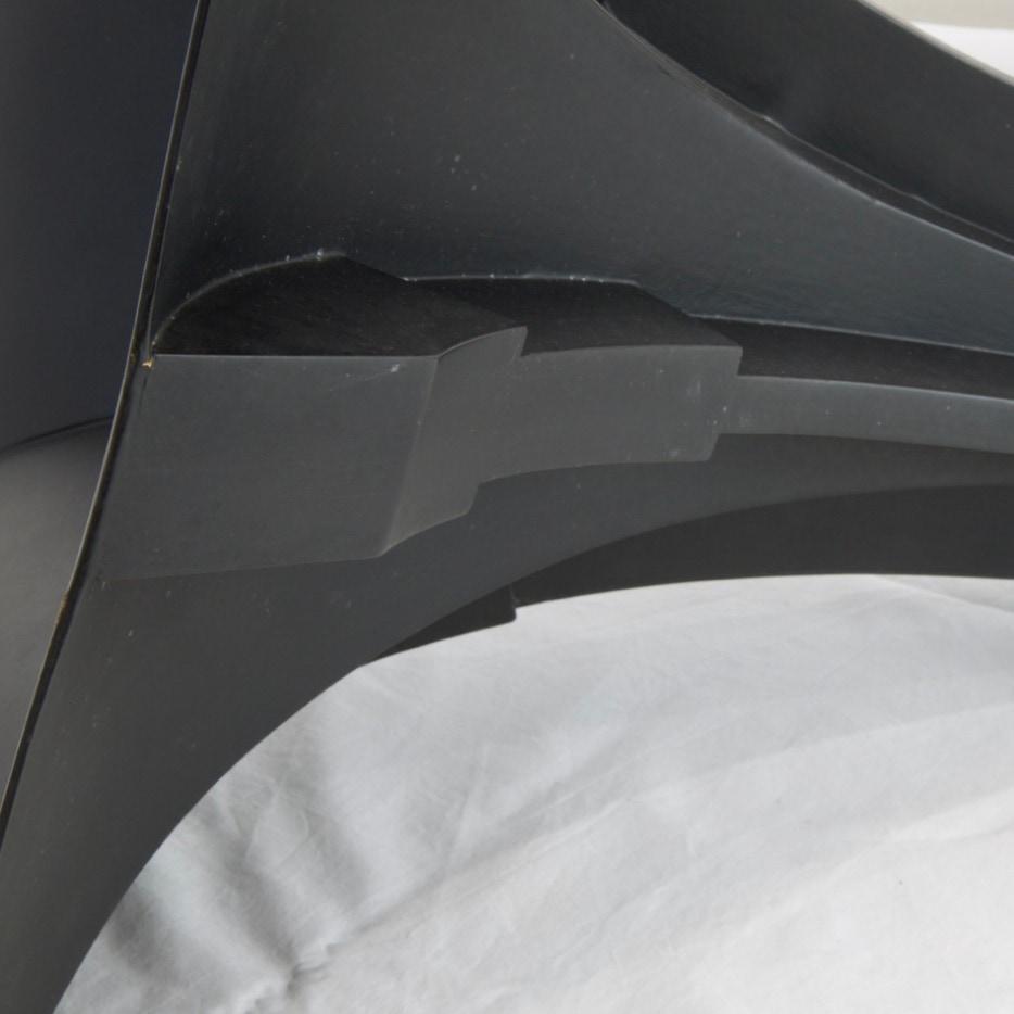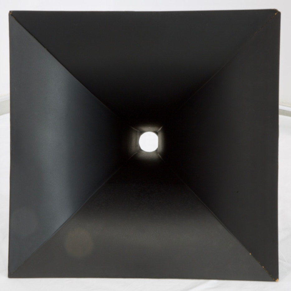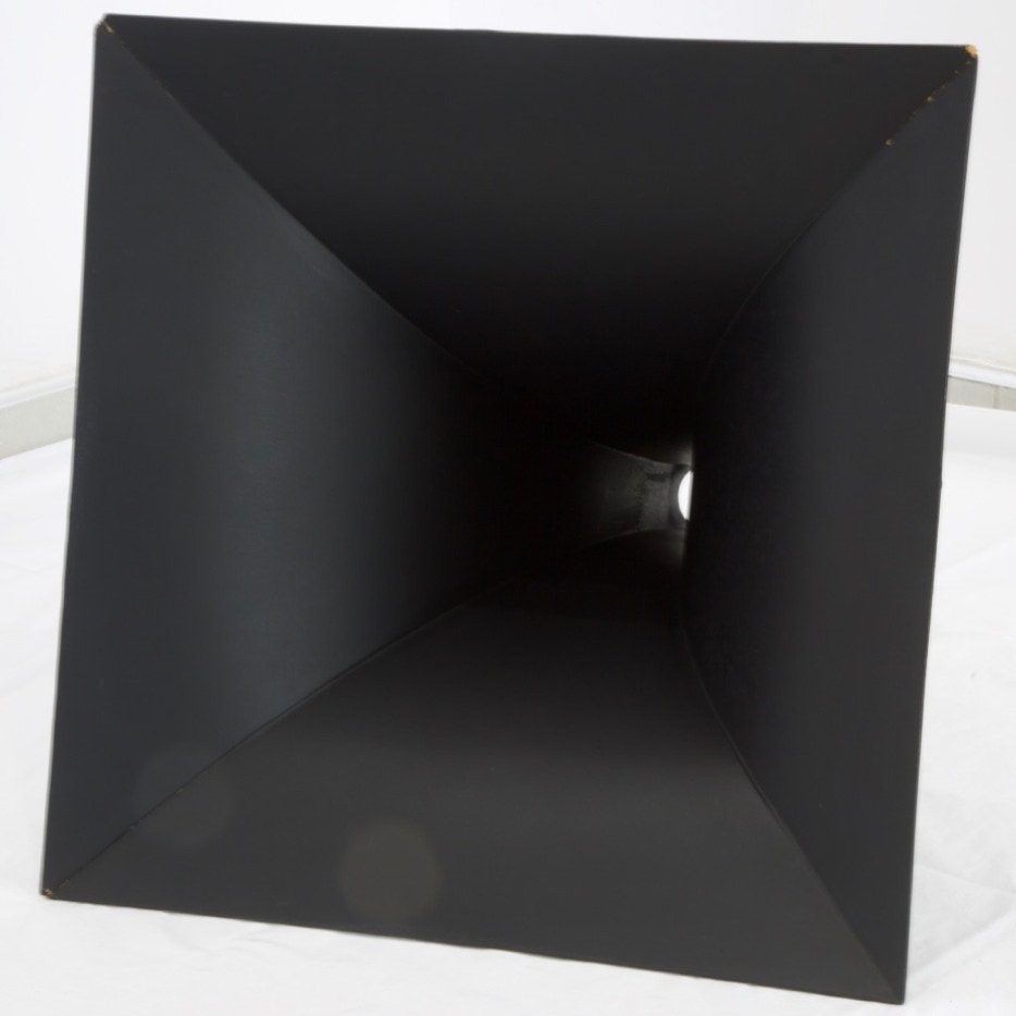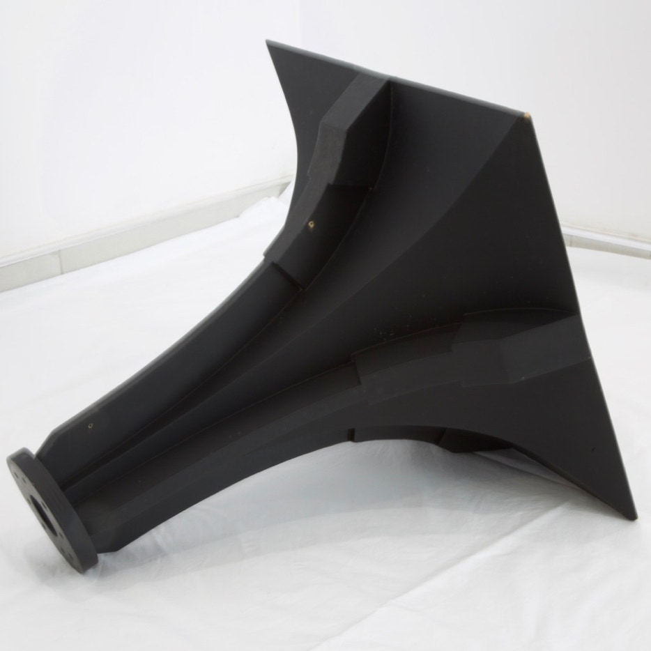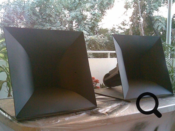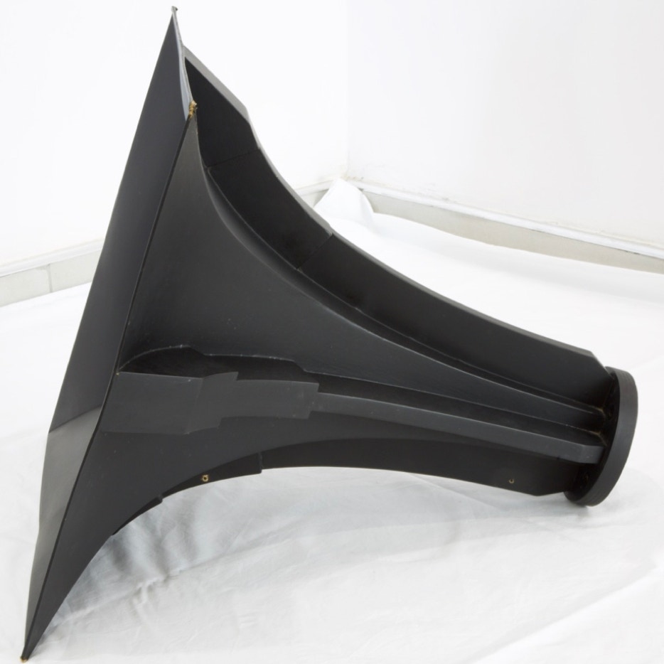 Donc ces fameux pavillons "provisoires" sont réalisés en médium de 3mm. Afin de les maintenir des planches de contreplaqué sont découpés au profil recherché puis collées ensemble. Sous forme d’arêtes dorsales elle débute à 22mm, s'élargissent à 46mm et finissent à 72mm. Les 4 cotés réalisés sont ensuite collés ensembles pris en sandwich. Le tout est soigneusement poncé, mastiqué et peint au pistolet à la peinture polyuréthane noire satiné identique aux enceinte.