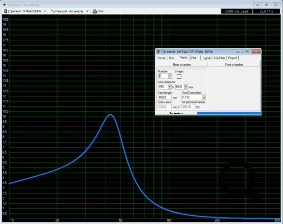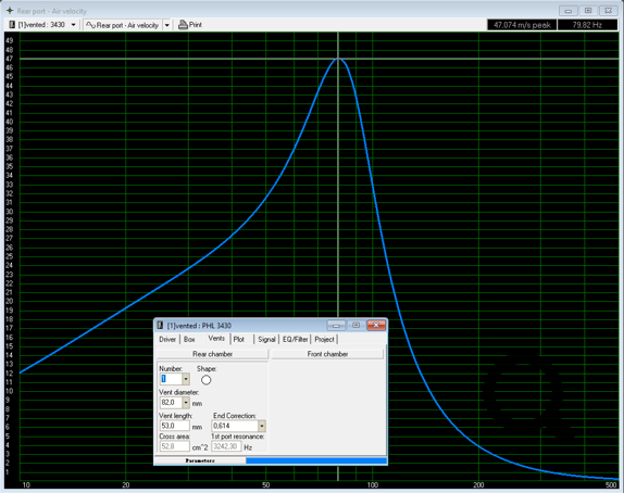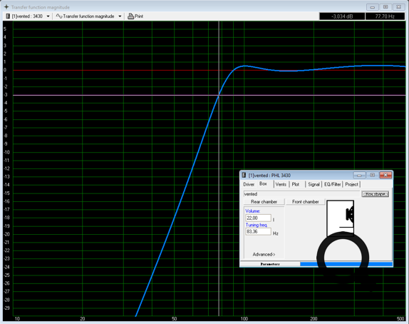 En ce qui concerne la charge on reste sur du basse reflex avec un volume de 22L et un accord à 83Hz. Pour des raisons esthétique l'évent aura un diamètre de 83mm et une longueur de 53mm afin de respecter la fréquence d'accord recherchée.