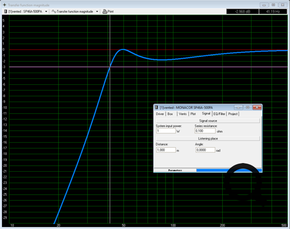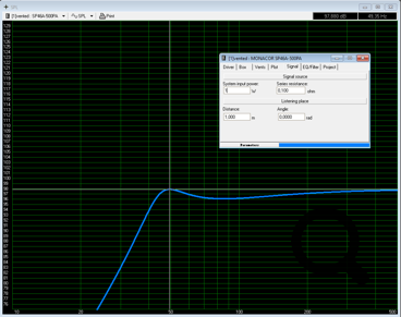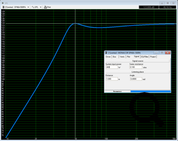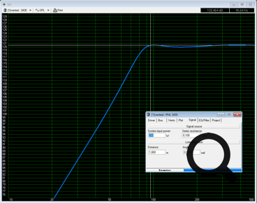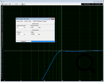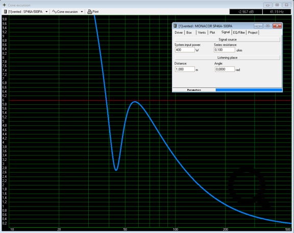 L'estimation de la puissance maximale est limitée par l'élongation admissible du haut parleur. Dans notre cas +/-6mm pour 400W. Cela est confortable car le haut parleur de basse est alimenté par un amplificateur 1000ASP de 500WRMS.