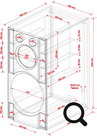 La première étape est de fixer le volumeinterne minimum requis en fonction des différentes charges. Soient 250L pour les basses et 15L pour les médiums. A cela faut rajouter les volumes de tous les autres éléments et prendre en compte l’épaisseur des parois.