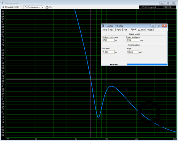 A puissance maximale admissible du haut parleur soit 250W l'élongation ne dépasse pas le seul maximum de 4.5mm donc tout va bien. Pour rappel l'amplificateur du système V7 est un BK MF300 de 200W, sytème V8 un Zenquito de 80W et à partir du système V9 on utilise un amplificateur HYPEX NC400 de 200W sur 8 ohms.
