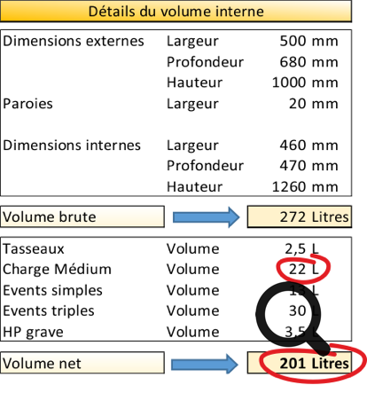 L’objectif est atteint, 22L de charge pour les médiums et 201L pour le HP des basses.
