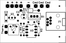 Un circuit imprimé simple face avec tous les composants. On soude les fils de raccordement directement sur la platine. Un connecteur RJ11 permet la programmation du PIC depuis le programmateur. Cela est également très utile pour le débogage ou la visualisation des valeurs durant l’exécution.
