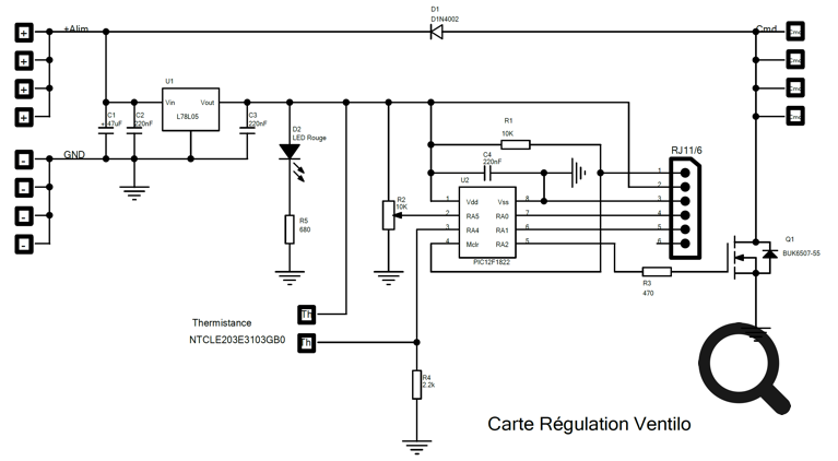 Le schéma de principe est simple. Un régulateur 7805 reçoit la tension de 5-30V et régule un 5V pour toute la carte. Un microcontrôleur de type PIC assure la régulation. Une entrée analogique pour la sonde de température. Une entrée analogique pour ajuster la consigne. Un transistor pour le pilotage du ventilateur en PWM. La tension de pilotage du ventilateur est celle à l’entrée de la carte soit 5-30V.