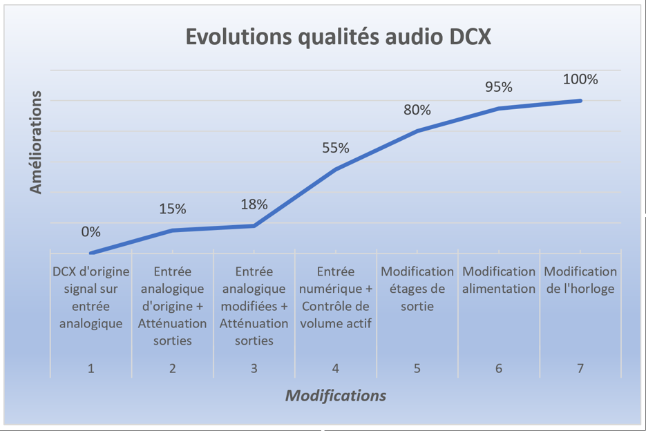 En conclusion et d’après mon expérience je ne peux que vous conseiller d’utiliser l’entrée numérique du DCX avec un contrôle de volume en sortie. La modification des étages de sortie est essentiel, le remplacement de l’alimentation est un plus et celui de l’horloge est inutile et peut sur certains modèles apporter un bug au démarrage.