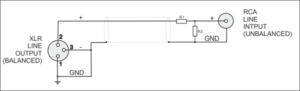 Transformateur adaptation d’impédance avec rapport de division. C’est de loin la meilleure des solutions mais également la plus onéreuse. Cela vous permet de dé-symétriser le signal proprement, d’atténuer le signal en sortie si vous utilisez un rapport de division. L’isolation galvanique évitera également les ronflements liés au bouclage de masse.