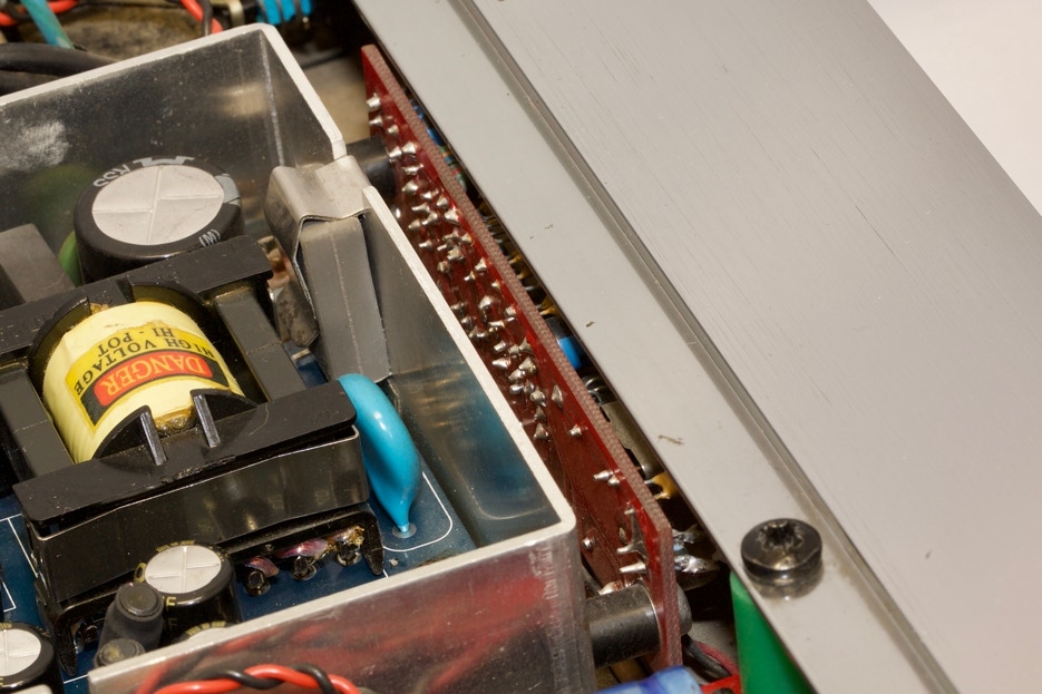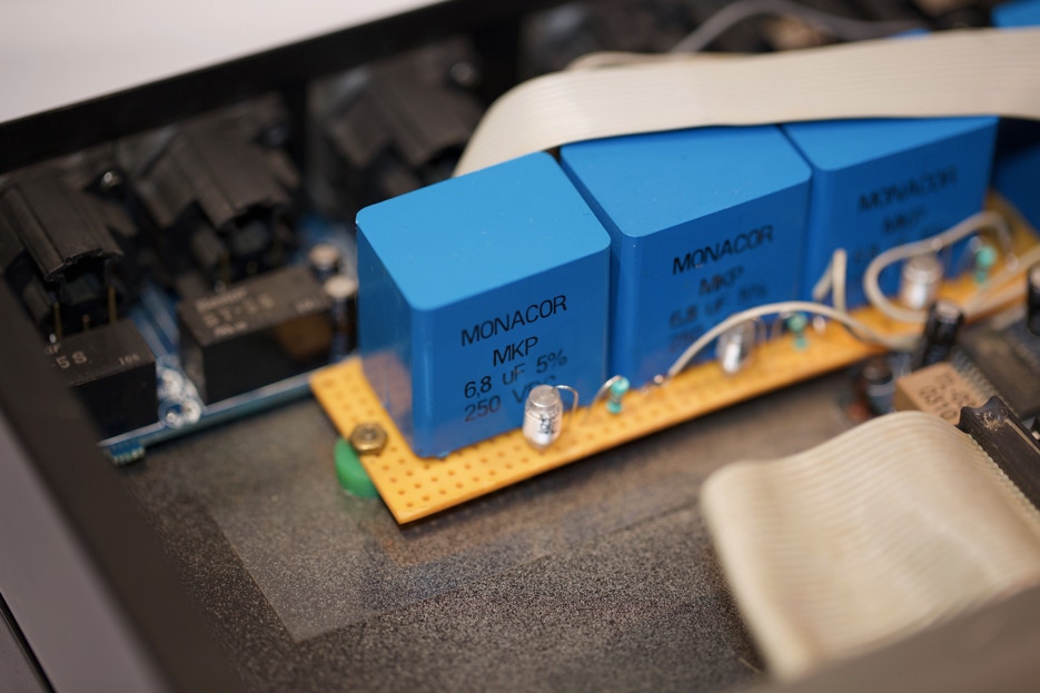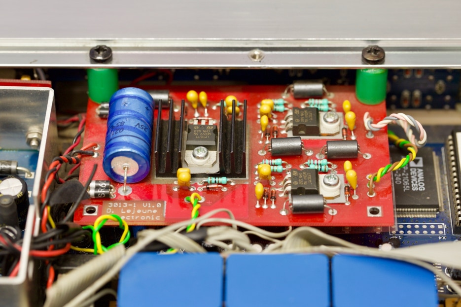 Concernant l'implantation, rien de bien compliqué. Les gros condos sont soudés en ligne sur une plaque d'essais avec les autres composants. La platine est boulonnée avec entretoises plastique et protégée par un film isolant afin d'éviter tout contact malencontreux au châssis. Cette configuration est très pratique car elle permet de loger cette carte supplémentaire entre la carte arrière et la carte DSP. Les connexions sont ainsi réduites au minimum. La nappe passe tout juste entre les condos et le capot du DCX.