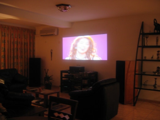 L’effet est vraiment «TOP». Un écran type cinéma de 2.5m de large avec pour seul inconvénient une pièce faiblement éclairé au risque de perdre fortement en contraste. Car ne l’oublions pas un vidéo projecteur ne projette pas du noir mais seulement de la lumière. Donc pour faire du noir sur un mur blanc il faut baisser la luminosité ambiante afin que le mur blanc soit le plus sombre possible.