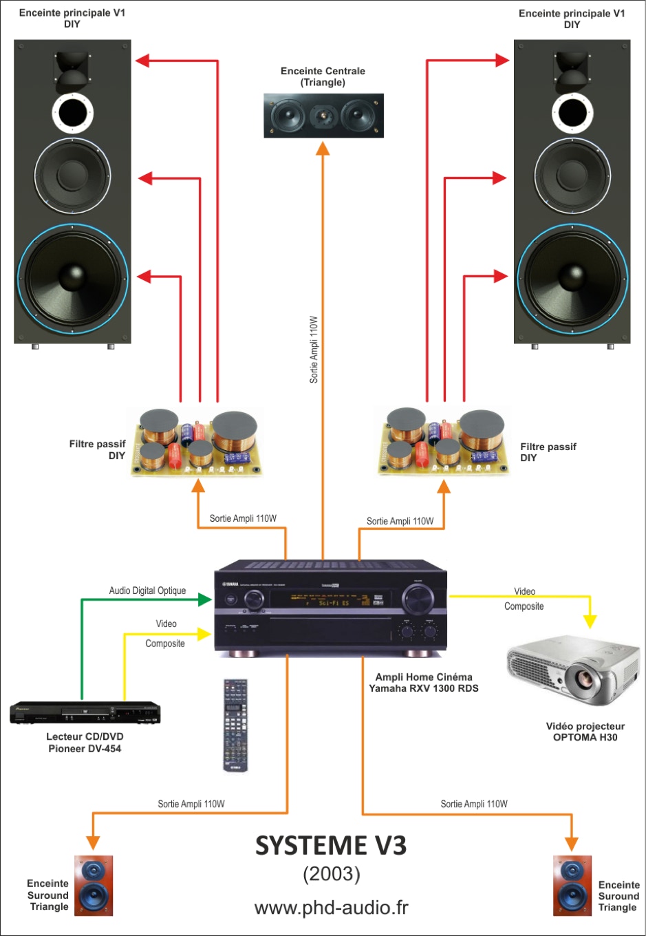 Pour ce qui est du Home cinéma, le son entre les différentes enceintes est déséquilibré du fait de la différence de rendement entre les avants, arrières et centrale. Il faut booster de 10dB sur les enceintes TRIANGLE afin de retrouver l’équilibre.